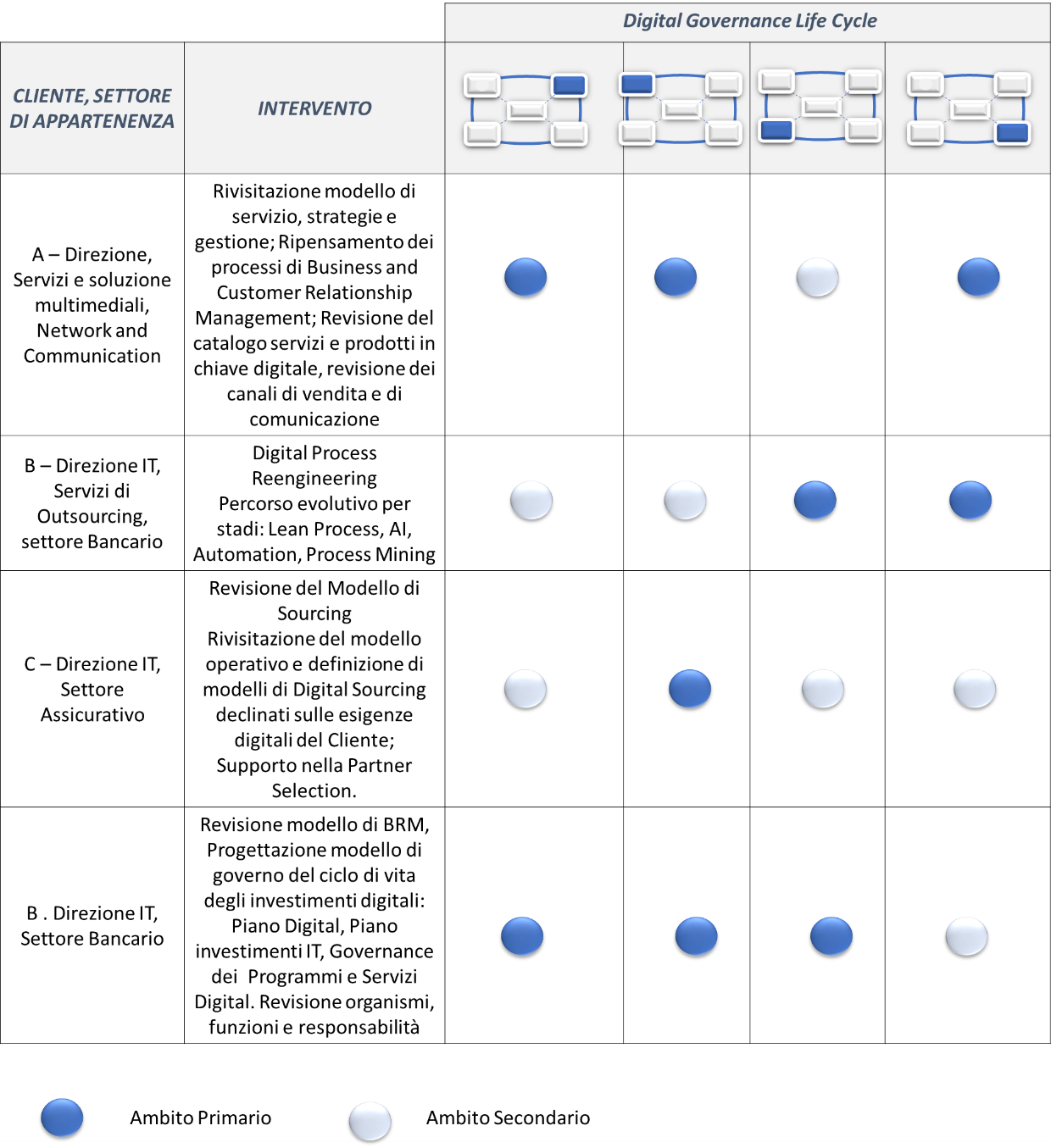 Nel concreto, lo sviluppo di un nuovo modello di “Digital Governance” richiede un approccio pragmatico che tenga conto del contesto di mercato delle organizzazioni Clienti e della loro “maturità” rispetto alle diverse dimensioni del ciclo di vita precedentemente descritto:
