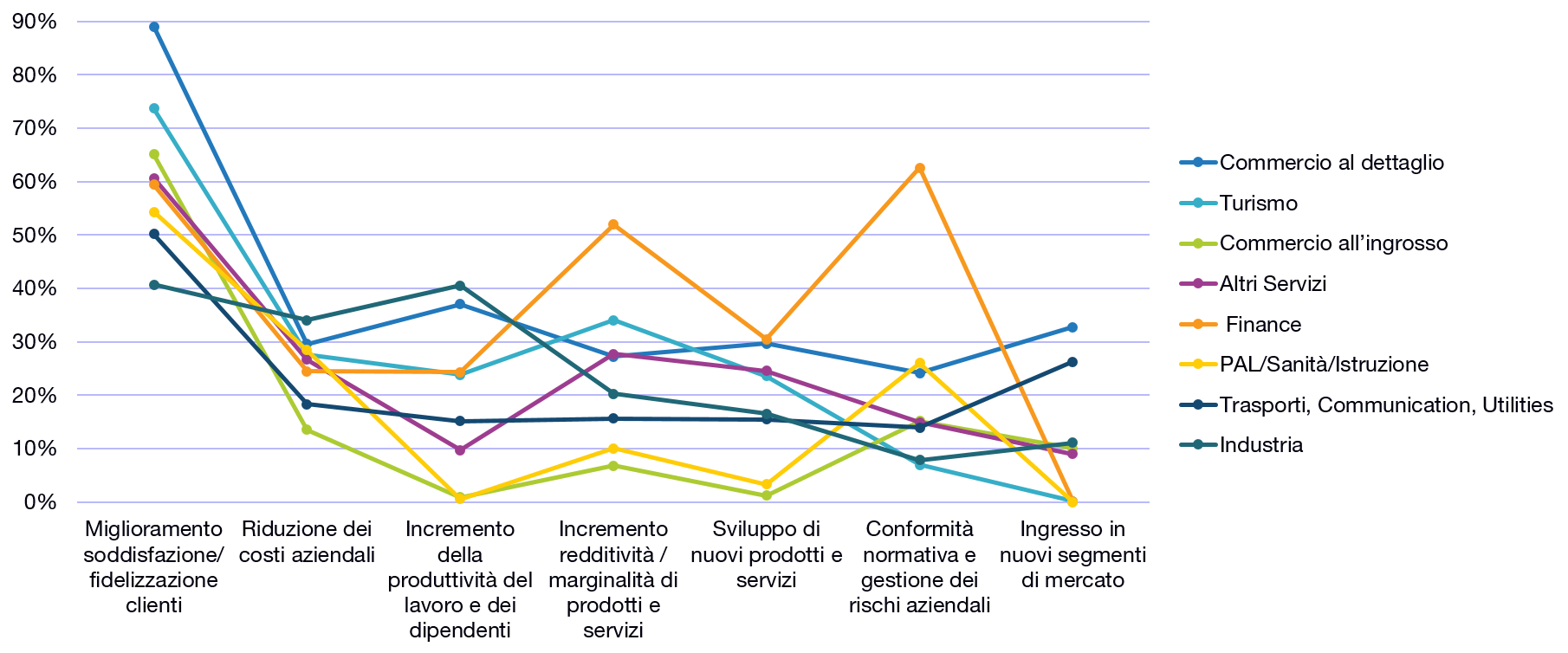 Per tutti i settori la soddisfazione del cliente è prioritaria, tranne che per il settore Finance in cui questa priorità è di poco superata dalla conformità normativa e gestione dei rischi aziendali e poi seguita da quella dell’incremento della redditività.