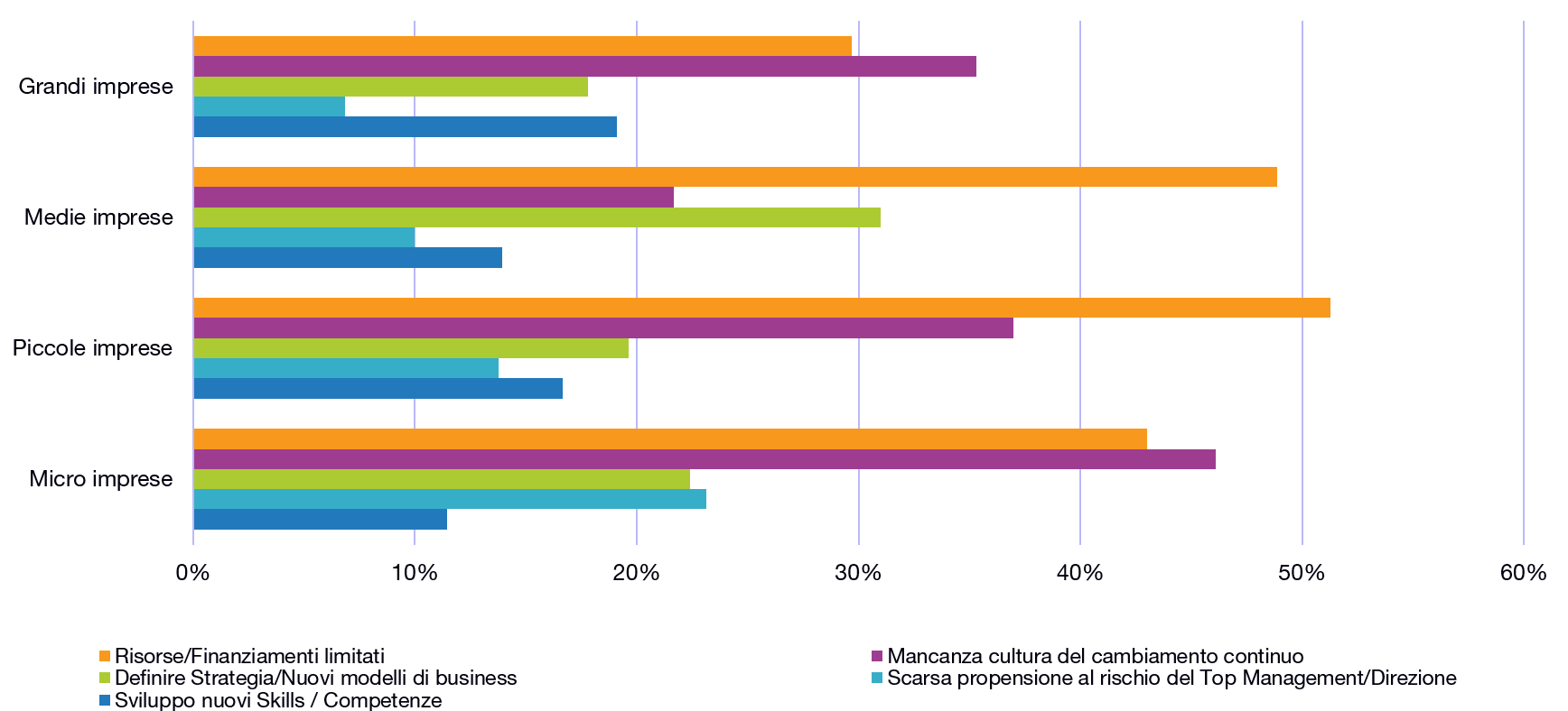 In particolare quest’ultima componente è percepita dal maggior numero di aziende grandi e dalle microimprese, mentre nelle piccole imprese è di molto secondaria a quella della scarsità di risorse e nelle medie imprese addirittura meno percepita della difficoltà di definire strategie e nuovi modelli di business.