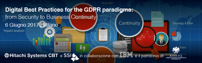 Hitachi Systems CBT e SSI in collaborazione con IBM e con il patrocinio di Assintel, organizzano l’evento Digital Best Practices for the GDPR paradigma: from Security to Business Continuity, che si terrà il 6 Giugno 2017 dalle ore 9,30 alle ore 13,00 presso Hotel Westin Palace – Milano, P.zza della Repubblica 20.