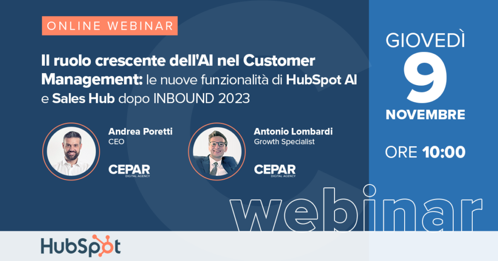 In questo webinar sveleremo le nuove funzionalità di HubSpot AI e Sales Hub, illustrando come queste tecnologie stiano rivoluzionando il modo in cui le aziende interagiscono con i clienti e ottimizzano le strategie di vendita.
