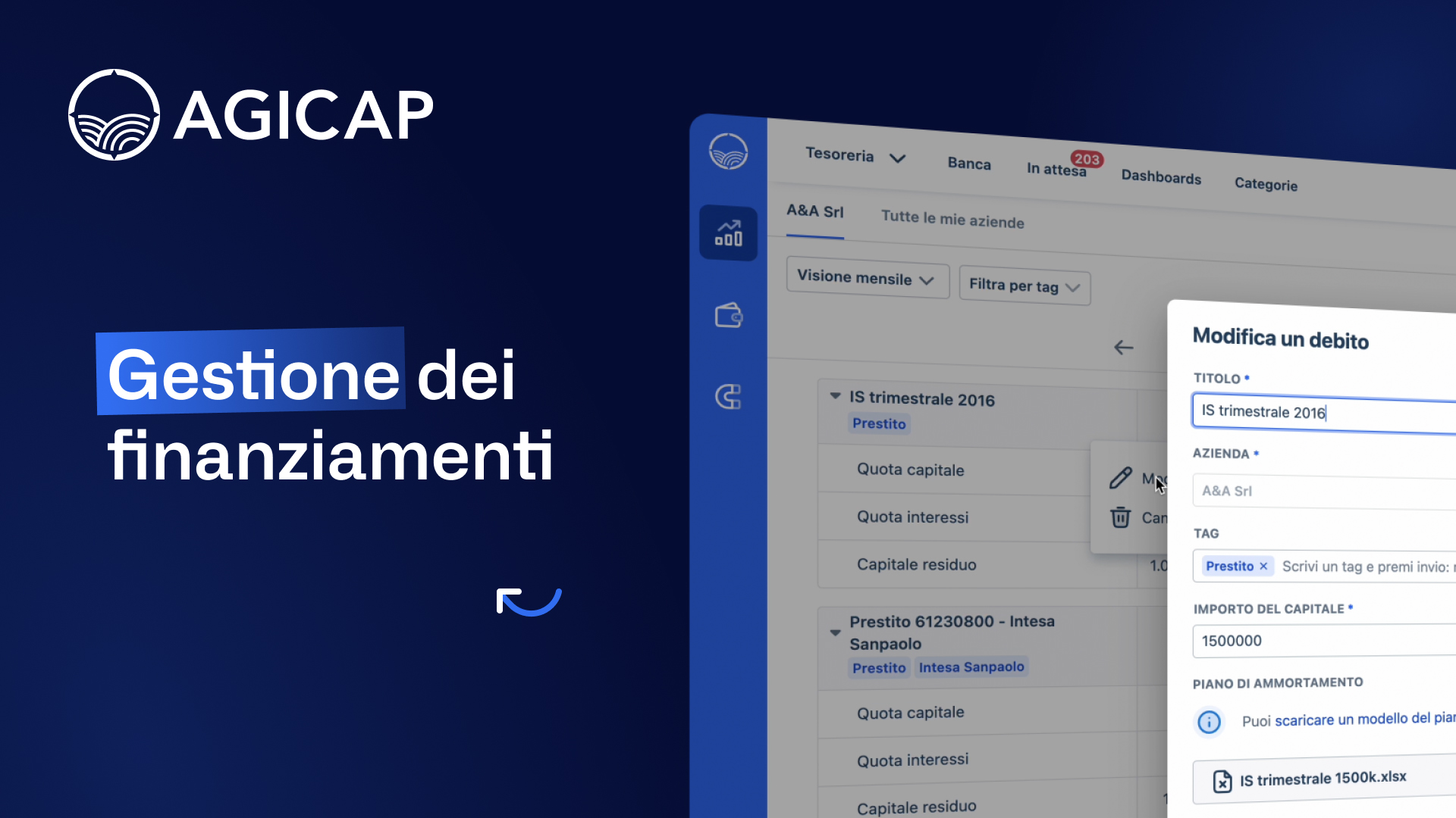 È necessario caricare il piano di ammortamento relativo a ciascun finanziamento per centralizzare tutti i tuoi finanziamenti in un unico punto. Per i finanziamenti a tasso variabile, il software calcola automaticamente gli interessi da corrispondere a ciascuna scadenza, basandosi sull’Euribor del momento. Agicap calcola anche il montante rimanente per ogni finanziamento, permettendoti di sapere quanto debito ti rimane da pagare in qualsiasi momento.