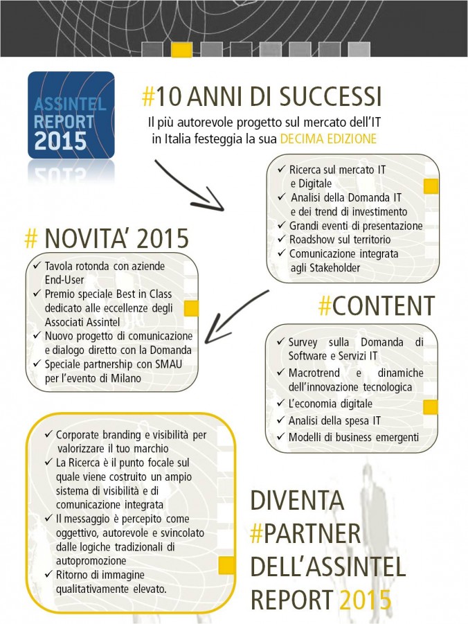 Anteprima Assintel Report 2015 Assintel Report 2015 è alle porte e compirà 10 anni. Vuoi farne parte? Guarda l'Offerta di Sponsorizzazione Contattaci per maggiori info
