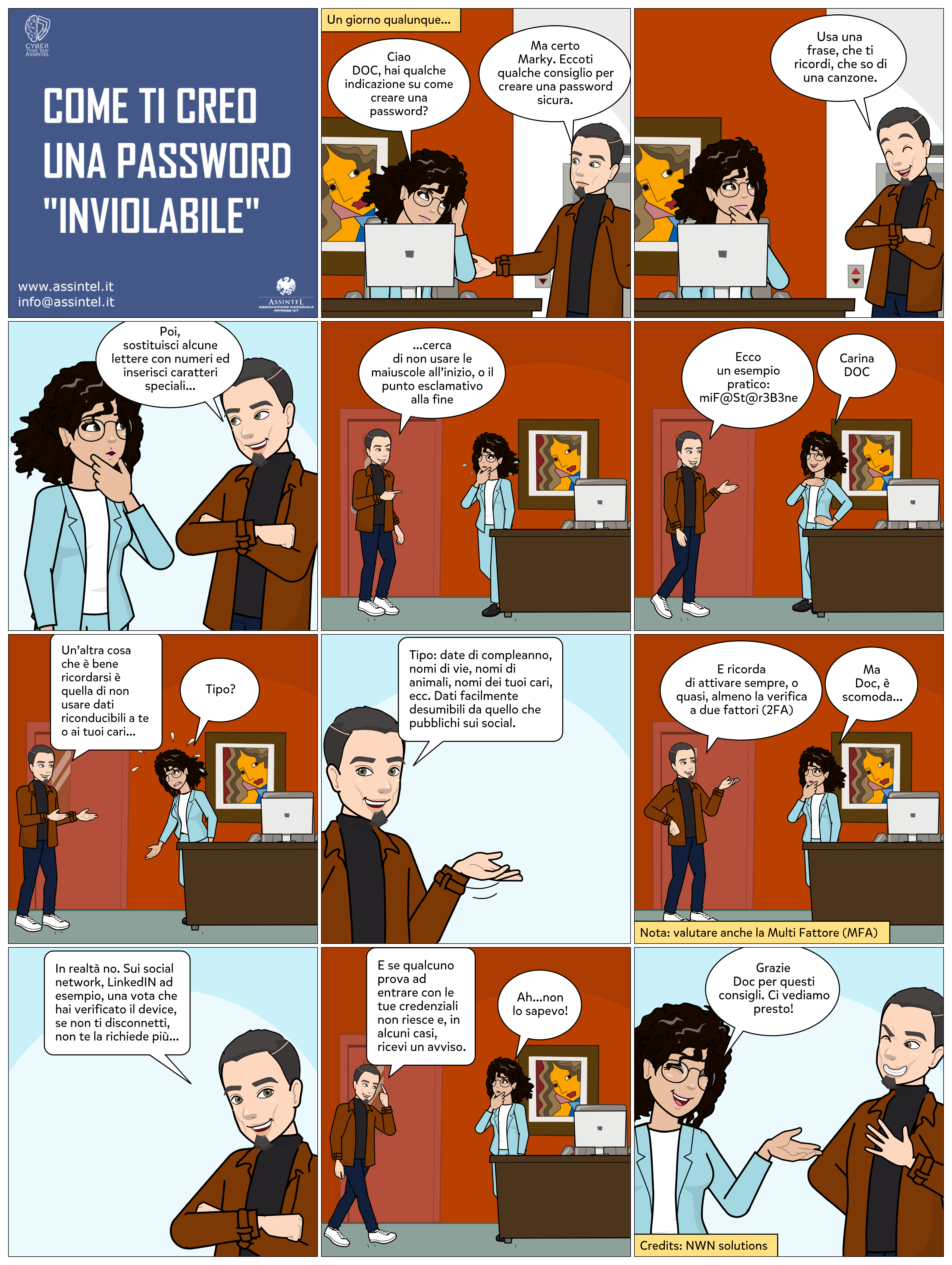 L'iniziativa affronterà via via i vari temi topici della cybersecurity: troverai elementi comunicativi fruibili con semplicità ed immediatezza, come fumetti ed infografiche, che potrai utilizzare sia nella tua azienda, sia come strumento informativo verso i tuoi clienti e partner.