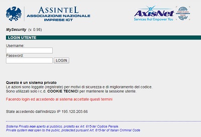 Uso dei dati personali / finalità: gli unici "dati personali" gestiti dal tool sono quelli identificativi relativi ai singoli utenti persone fisiche (sia ai sensi del d.lgs.196/03 che del Regolamento Europeo - GDPR). Tali dati saranno trattati da Assintel (privacy Assintel) ed AxisNet (privacy AxisNet) in regime di contitolarità per i soli fini di sicurezza del sistema e prevenzione di frodi informatiche.